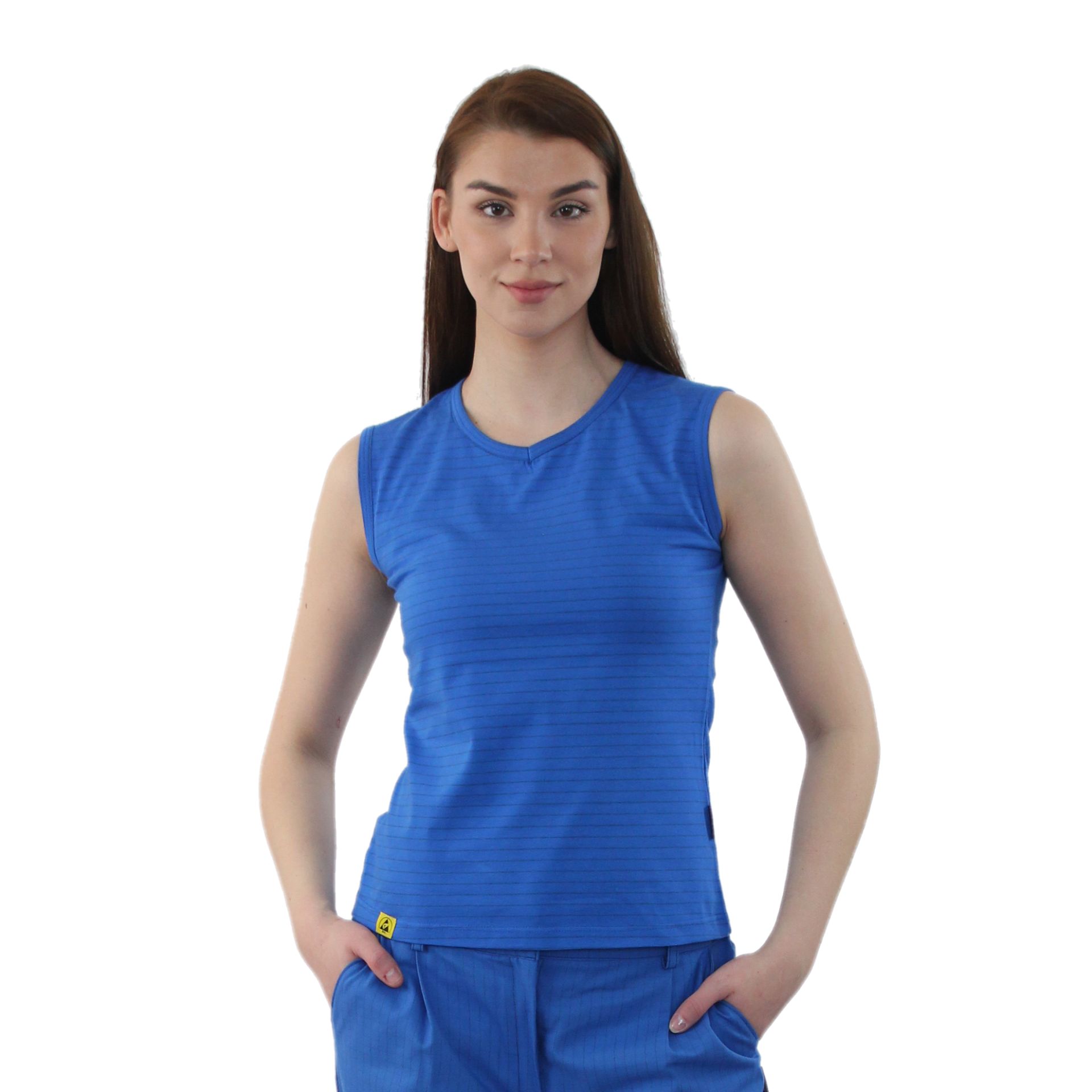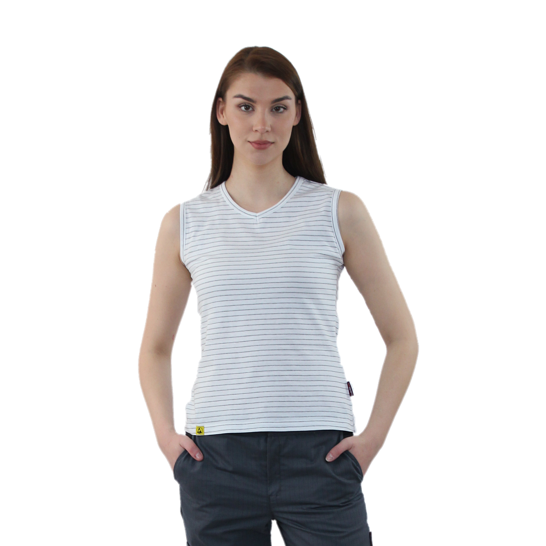 We offer comfortable cotton ESD sleeveless shirts with carbon fiber for increased production efficiency and work comfort. The combed cotton makes sleeveless T-shirts perfect physiological properties and feel touch and special yarns containing a precise amount of carbon-coated polyester fibers guarantee permanent anti-static properties.